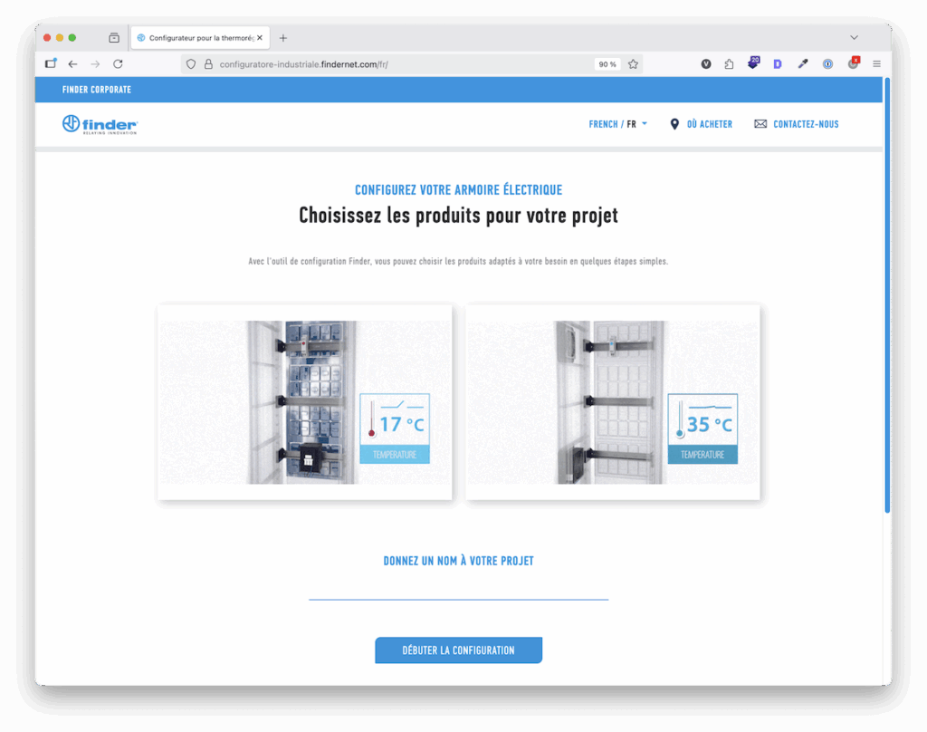 Pour aider les installateurs et bureaux d’études, Finder propose un outil en ligne gratuit de configuration des armoires. Ce configurateur industriel permet, en quelques étapes guidées, de choisir les bons composants (thermostats, résistances, ventilateurs, lampes, etc.) selon les dimensions et l’environnement de l’armoire.